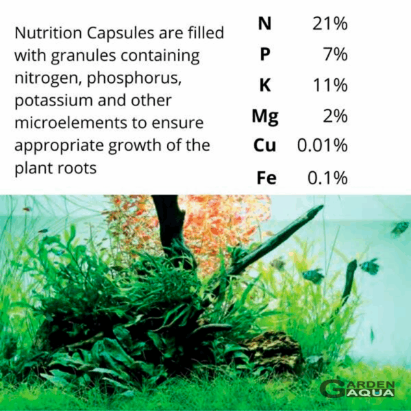 Las cápsulas liberan nitrógeno, fósforo, hierro y manganeso, así como todos los micronutrientes vitales, durante un periodo de 1 a 2 meses. Coloque las cápsulas cerca de las raíces de plantas grandes y solitarias, así como de plantas con raíces robustas.Las cápsulas no se descomponen completamente y las bolitas que contienen permanecen en el sustrato después de liberar todos los nutrientes. Están hechas de resina, que es biológicamente inocua.