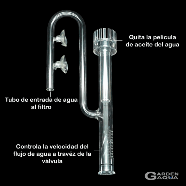 Pipeta realizada en vidrio para entrada de agua del acuario al filtro de 17mm, para mangueras 16/22mm. Incluye succion de superficie para eliminar la suciedad superior (funcion skimer) a la vez que se aspira el agua.