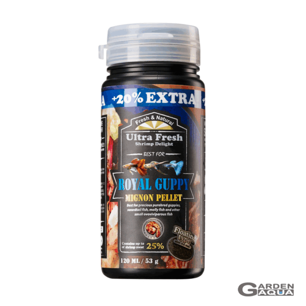 ALIMENTO NATURAL PECES OVOVIVÍPAROS Y VIVÍPAROS.Con un ratio entre carne y vegetales de 5:5.Recomendado para especies y variedades de peces guppys, espadas, mollies, platys, y otras especies de peces ovovivíparos y vivíparos.Proteínas 100% naturales de carne fresca, vegetales y algas marinas. 35% de Camarones espada silvestres. 15% de espirulina natural + algas. 0% de aditivos, colorantes artificiales o subproductos.Naturalmente nutritivo y formulado para un sabor a camarones delicioso.PELLET PREMIUM ROYAL GUPPY está enriquecido con yodo para obtener características de alta palatabilidad y un gran valor nutritivo para peces ovovivíparos como guppys premium.Se ablanda rápidamente en el agua para su consumo rápido y así poder mantener el agua limpia.Invertimos 10 horas de cocción a baja temperatura para dar al pez la mejor dieta.Enriquecido con probióticos intestinales, esta formulación se ablanda rápidamente en el agua para permitir la ingesta rápida, no dejando residuos, con lo que se mantiene el agua limpia siempre.Favorece la ultra coloración natural gracias al 15 % alga noruega + espirulina australiana.Incluye polisacáridos de Ganoderma, ajo y adicionado con vitaminas del grupo B para fortalecer su sistema inmune.Fórmula de Calidad Premium para un refuerzo inmunológico: rico en nutrientes valiosos como polisacáridos de Ganoderma, ajo, espirulina australiana, vitamina A, D3, C, E, B1, B2, B6 y B12), β-caroteno, minerales naturales y oligoelementos.Tipo flotante.