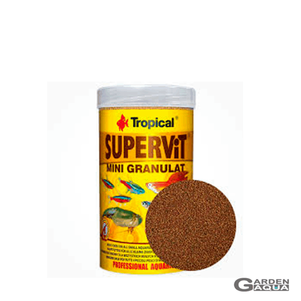 SUPERVIT MINI GRANULAT Un alimento completo en gránulos finos que hunden, destinado para la alimentación diaria de los peces pequeños y los alevines crecientes. El granulado contiene un inmunoestimulador natural: beta glucano y vitamina C estibilizada que refuerzan el sistema inmunológico, ayudando a los organizmos de los peces en la lucha contra los patógenos. Varias decenas de seleccionados elementos de la calidad más alta, complementados con una serie de vitaminas y microelementos seleccionados de manera óptima, cubren necesidades energéticas y alimentarias de las especies más exigentes.
