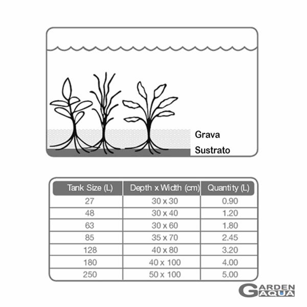 El sustrato para el crecimiento vegetal se coloca en una capa de 1 cm de espesor en el fondo del acuario una vez construido. La tabla a continuación muestra las cantidades recomendadas de sustrato para el crecimiento vegetal para acuarios de diferentes tamaños.