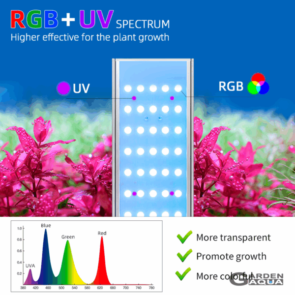 *Adecuado para tanques de agua dulce, recomendado para tanques estrechos y poco profundos.*RGB + UV de espectro completo, esta es una gran luz para dar una amplia gama de efectos. Puede promover la fotosíntesis de las plantas, hacer el paisaje más colorido y vivo, y hacer el acuario más transparente.**Control por Bluetooth, hay 6 modos de recomendación, 5 modos personalizados, regulación continua y modo de puesta de sol, adecuado para la plantación de diversos peces y plantas acuáticas.*El modo personalizado puede configurar múltiples interruptores de tiempo, color y brillo, etc.
