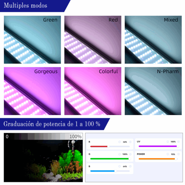 *Adecuado para acuarios pequeños, tanques de agua dulce, recomendado para tanques estrechos y poco profundos.*RGB espectro completo, esta es una gran luz para dar una amplia gama de efectos. Se pone de manifiesto los diferentes colores de los peces, hacer que las plantas acuáticas más verde y hermoso. hacer que el paisaje más colorido abnd vívida, y hacer que el acuario más transparente.*Botón de control, hay 5 modos de recomendación, modos personalizados, función de temporización, Stepless atenuación y el modo de puesta del sol del amanecer, adecuado para la siembra de diversos peces y plantas acuáticas.