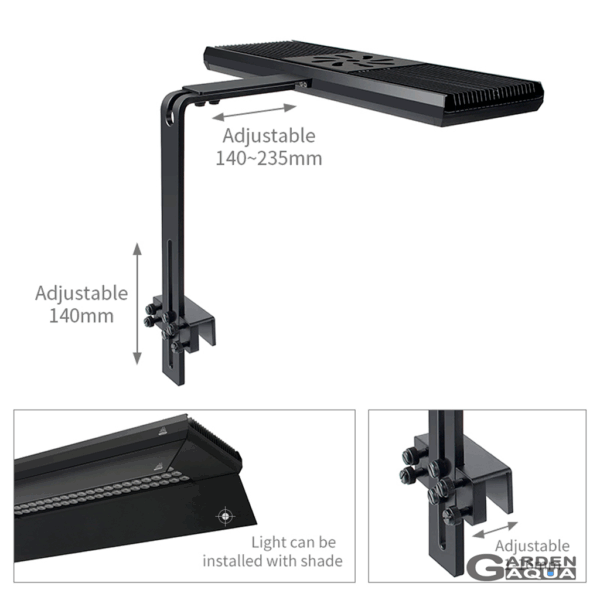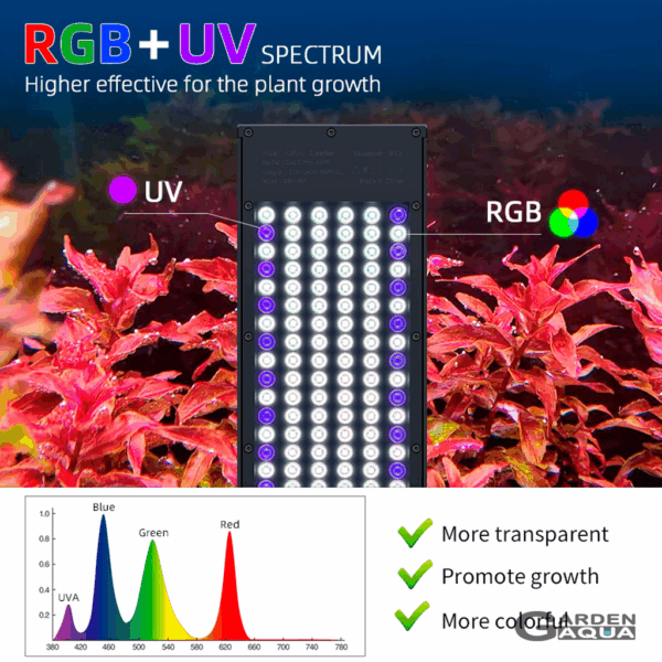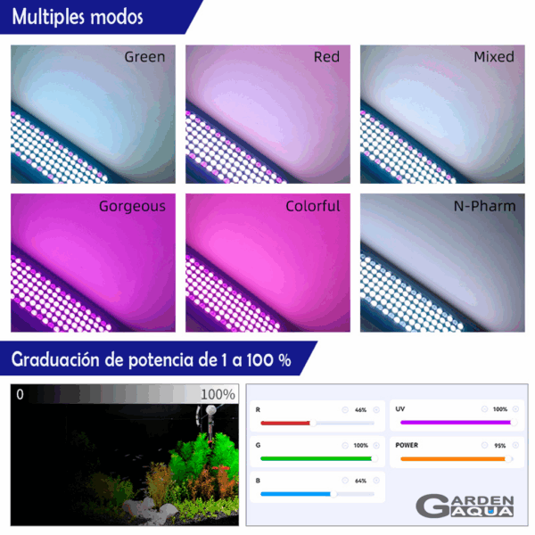 *Adecuado para acuarios pequeños, tanques de agua dulce, recomendado para tanques estrechos y poco profundos.*RGB espectro completo, Esta es una gran luz para dar una amplia gama de efectos. Destaca los diferentes colores de los peces, hacerplantas acuáticas más verde y hermoso. hacer que el paisaje más colorido y vivo, y hacer que el acuario más transparente.*Botón de control, hay 5 modos de recomendación, modos personalizados, función de temporización, Stepless atenuación y el modo de puesta del sol del amanecer, adecuado para la siembra de diversos peces y plantas acuáticas. Largo: 40cmHasta acuarios de 40 – 60 cmAncho: 14 cmAltura máxima: 30 cmPotencia: 90wLúmenes: 5850 lmNumero de leds: 120